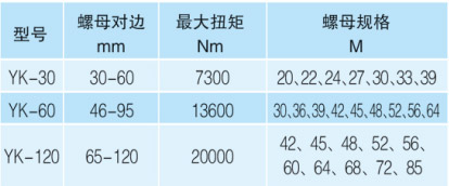中空式液壓扭力扳手YK系列:我公司生產的YK系列中空式液壓扭力扳手最大限度地采用高強度材料制造, YK型中空式扳手,工作壓力為600bar,扭矩可自由設定,精確度為±3%,反作用力臂可360°旋轉,使操作者使用方便,液壓扳手專用泵配有超高壓自動保護裝置,安全可靠。